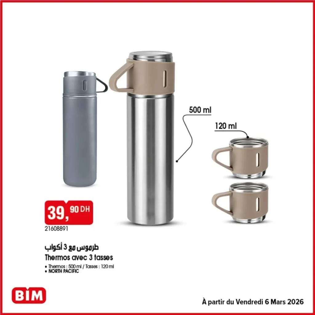 Dans le Catalogue BIM vendredi 6 mars 2026, découvrez une sélection d’accessoires pratiques pour la cuisine: thermos de 500 ml accompagné de 3 tasses à 39,90 DH.