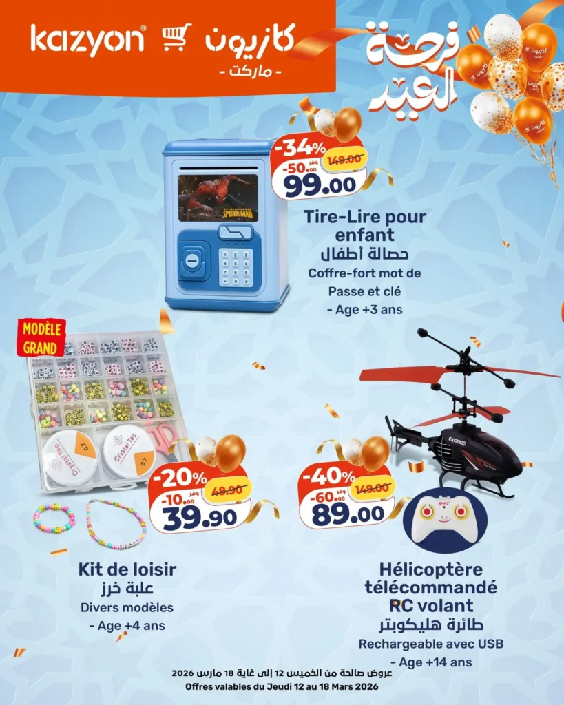 Le nouveau catalogue Kazyon du 12 au 18 mars 2026, présente plusieurs promotions sur différents produits tels que les articles de cuisine, la décoration, les vêtements pour enfants, les jouets et l’électroménager. À l’occasion de فرحة العيد, les magasins Kazyon proposent également des réductions attractives sur de nombreux articles essentiels pour la maison. Découvrez ci-dessous les meilleures offres disponibles dans le catalogue Kazyon Maroc du 12 au 18 mars 2026.
